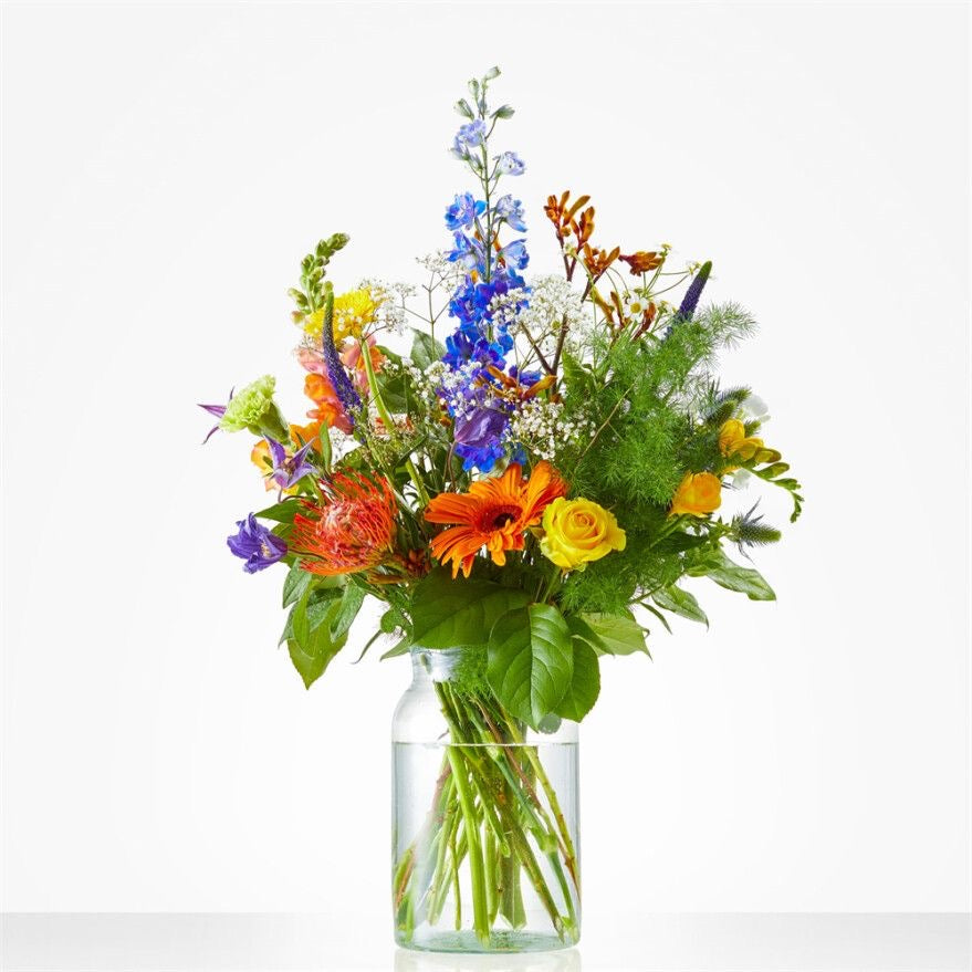 Dit kleurrijke boeket wordt met liefde samengesteld door de lokale vakbloemist. Een rond gebonden boeket met de mooiste bloemen van het seizoen.